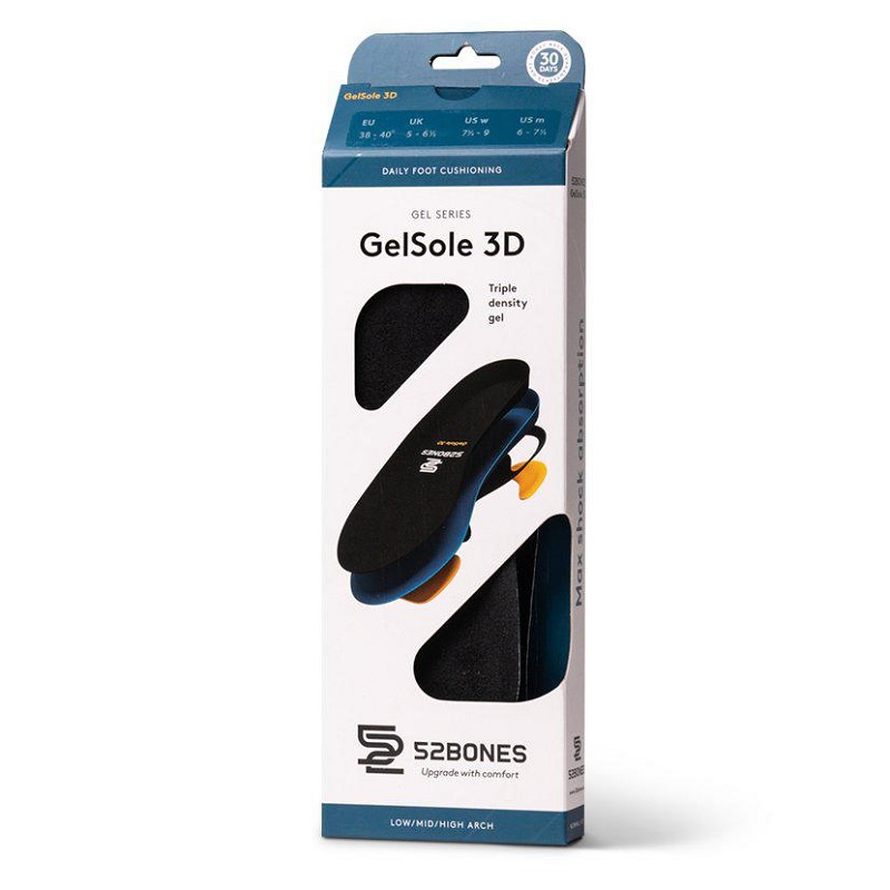 Gelsulor i TPE för maximal stötupptagning. Tre olika densiteter av TPE-gel ger dämpat stöd för hela foten, även sidorna, genom hälkoppen. Vagga för mellanfoten stödjer och stabiliserar. Ytskikt i polyester och bambu viskos. Passar alla hålfotsvalv.