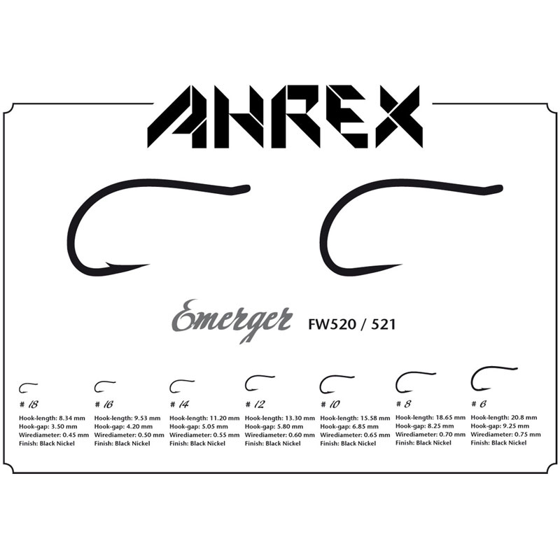 Ahrex 520 Emerger Ahrex FW520 Emerger är en klassisk design på flugbindningskrok till kläckare. Black Nickel, kemiskt vässad med lite hulling. 24 krokar per paket.