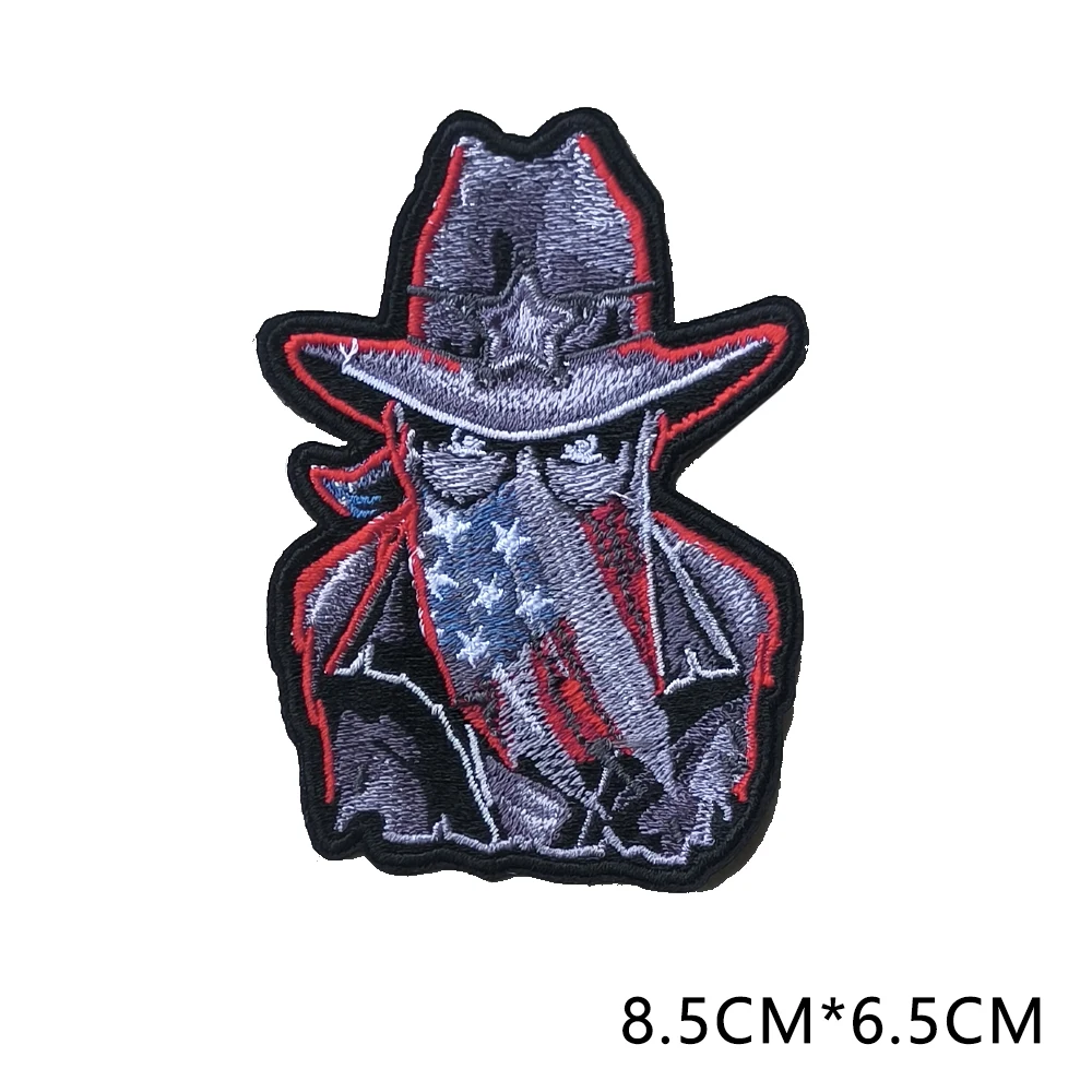 Skapa ett starkt och oförglömligt intryck med denna exklusiva patch med äkta cowboykänsla. Den pryds av en mystisk figur med en bandana som inspirerats av den amerikanska flaggan – perfekt för att tillföra en patriotisk och robust touch till dina jackor, ryggsäckar eller hattar. Designen fångar verkligen essensen av den fria, Wild West.