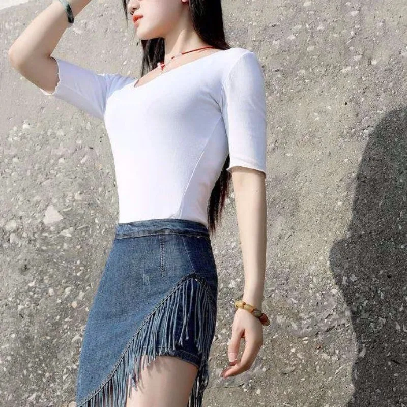 Fira Western Elegans med Asymmetrisk Frans Denim Cowboykjol med Inbyggda Shorts