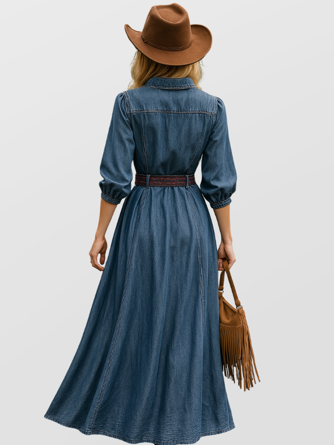 Avslappnad western denimmaxiklänning med korta ärmar