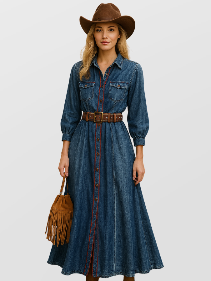 Denna mångsidiga denimklänning passar utmärkt vid utomhusevenemang, avslappnade kvällar och även semi-formella tillställningar. Kombinera den med boots för en klassisk western stil eller addera moderna accessoarer för en fräsch kontrast. Med sin unika design och höga bärkomfort blir den snabbt en favorit i din garderob.