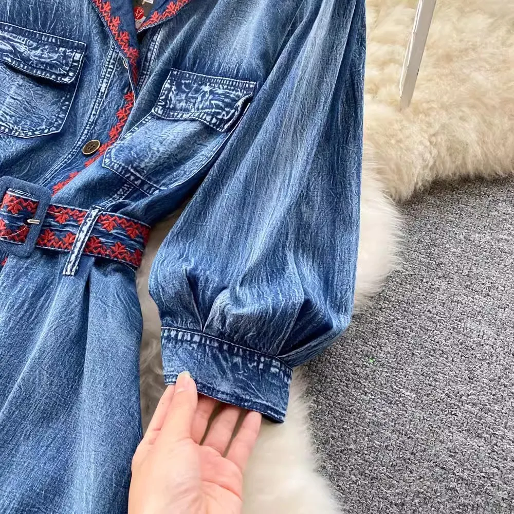 Blå denim midi klänning med blommigt broderi och bälte