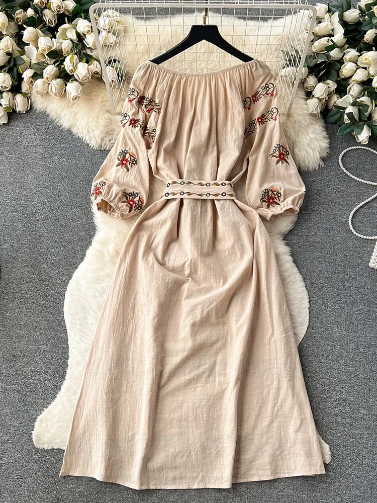 Broderad boho maxiklänning med bälte och lampionsärmar