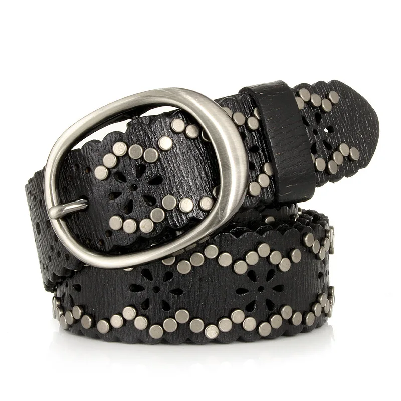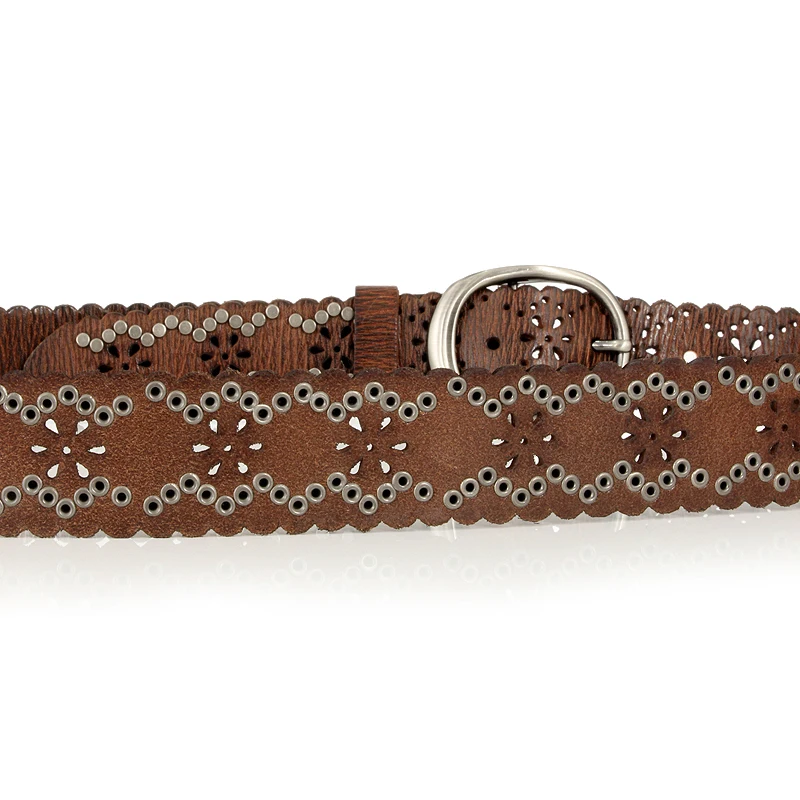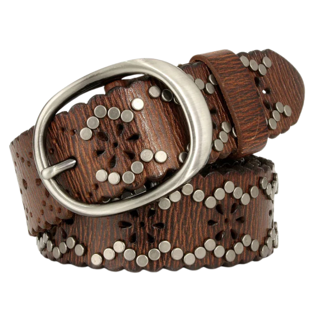 Detta westerna läderbälte är ett oumbärligt tillskott i varje garderob. De unika nittade blommiga utskärningarna ger bältet en kvinnlig och modern twist som smälter samman med klassiska westerninspirationer. Perfekt för att komplettera allt från en bohemisk vardagslook till en mer uppklädd outfit när du vill stå ut med stil.