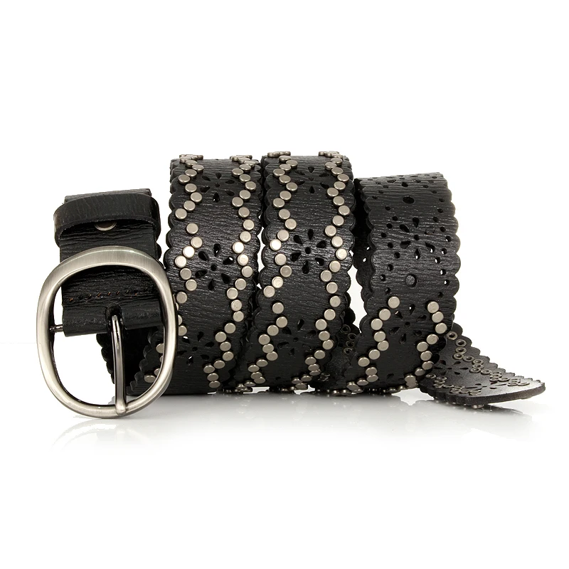 Detta dam nittade läderwesternbälte är den ultimata accessoaren för dig som vill ge din look en djärv, autentisk western-touch. Bältet är tillverkat av äkta nötköttsläder av högsta kvalitet och pryds med stilfulla nitar i ett unikt blommigt utskärningsmönster. Oavsett om du klär dig för en avslappnad dag ute, en festlig kväll eller en specialanpassad tillställning, blir detta bälte en riktig statement-accessoar.