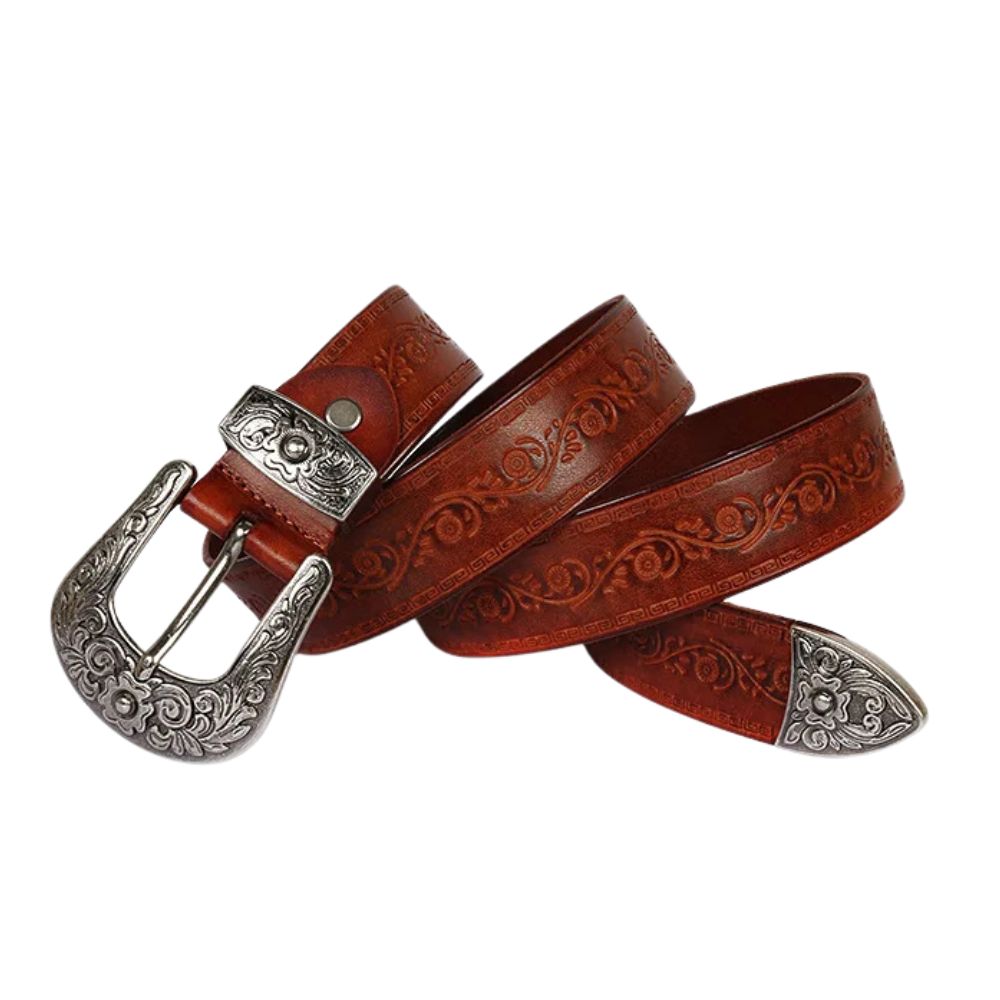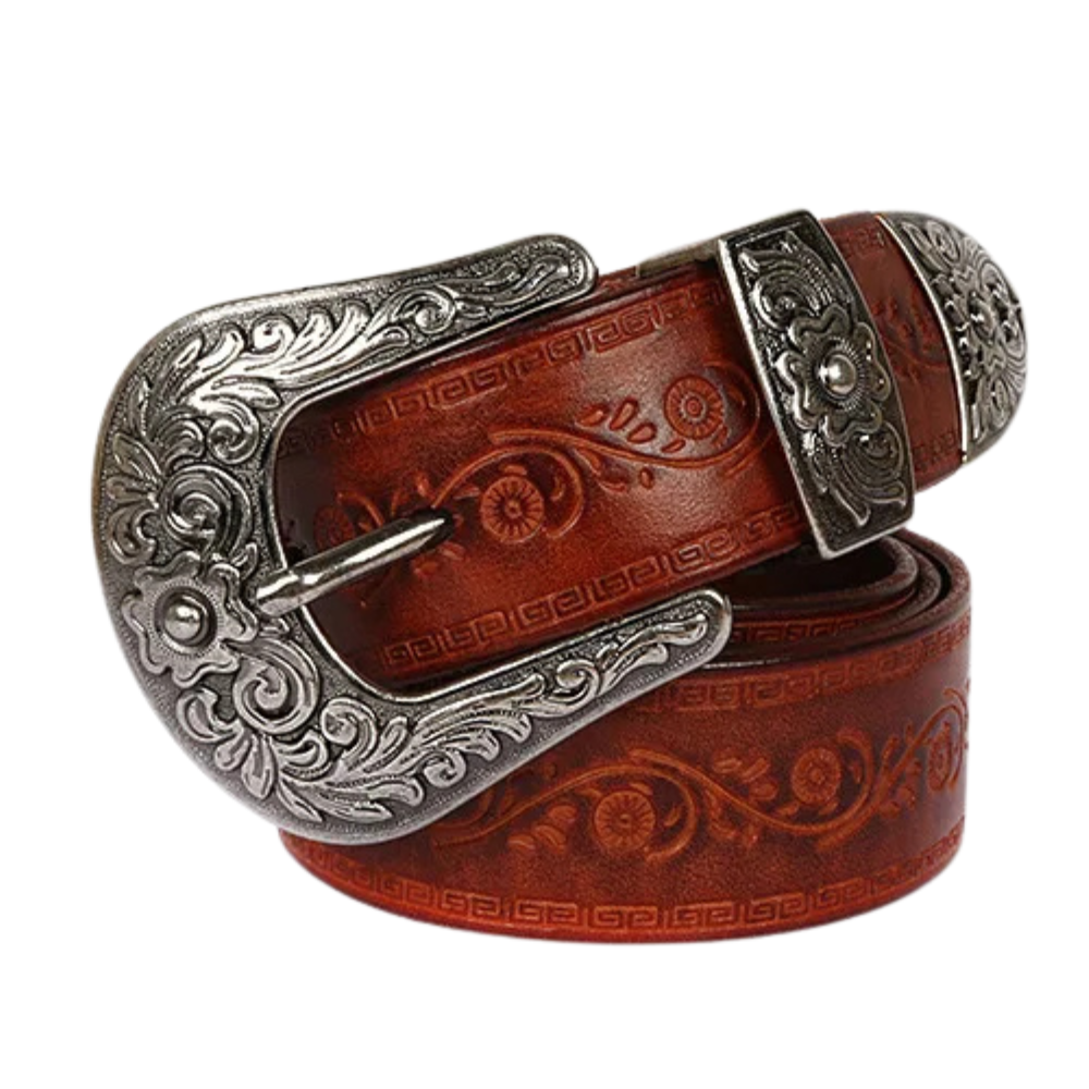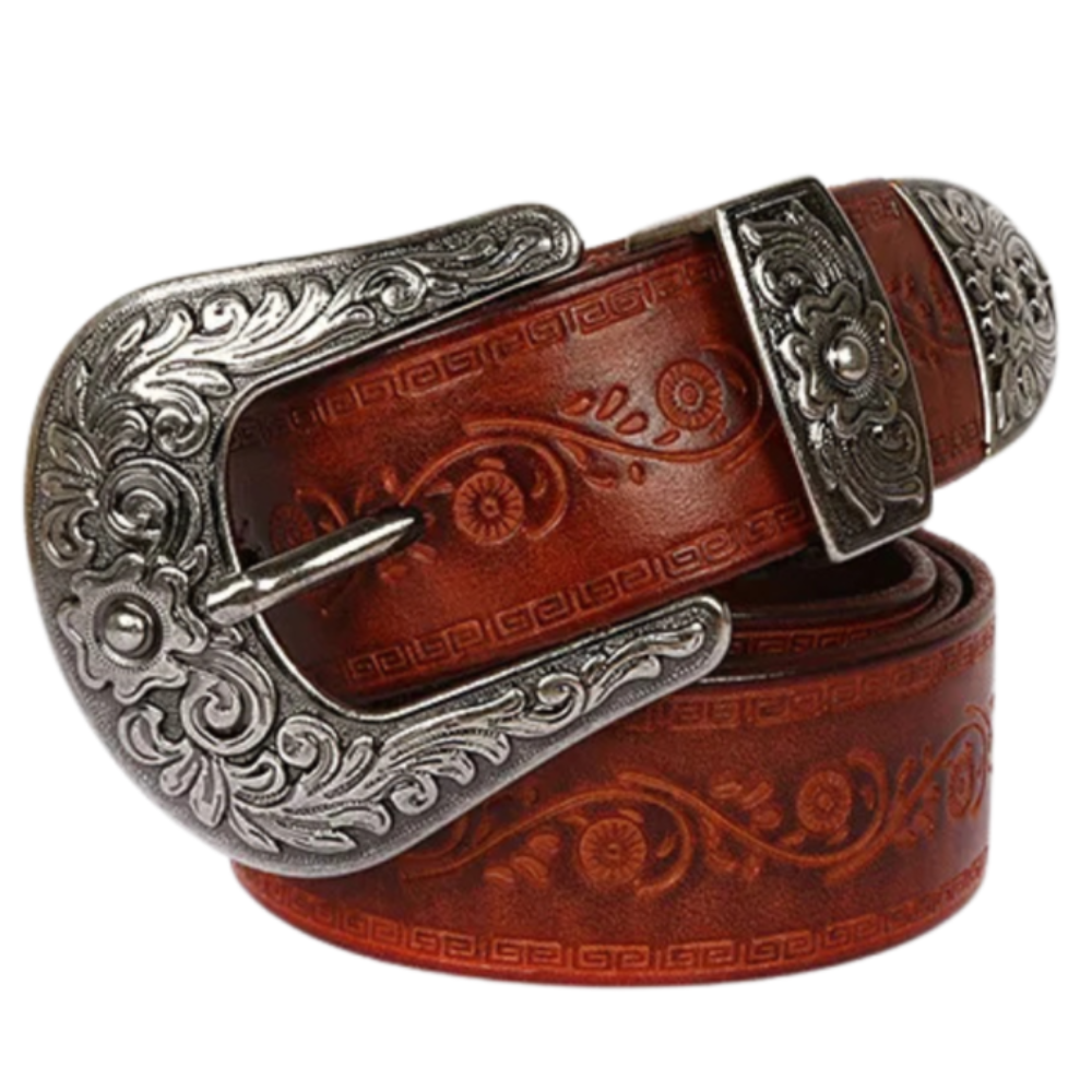 Bältet pryds av ett utsökt detaljerat blommönster längs med läderremmen, vilket förstärks av det imponerande spännet i metall. Designat för att hålla över tid och kombineras med både vardags- och festkläder, är detta bälte en mångsidig accessoar som ger en stark känsla av rustik elegans och autentisk westerncharme.