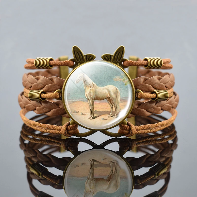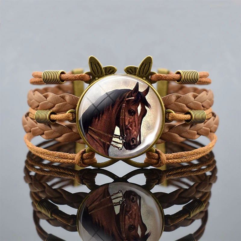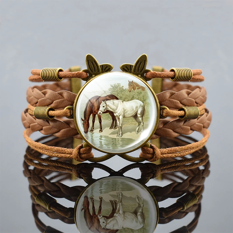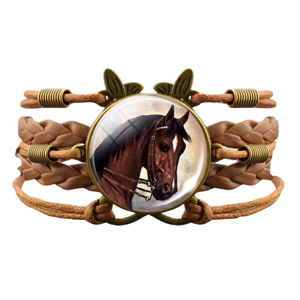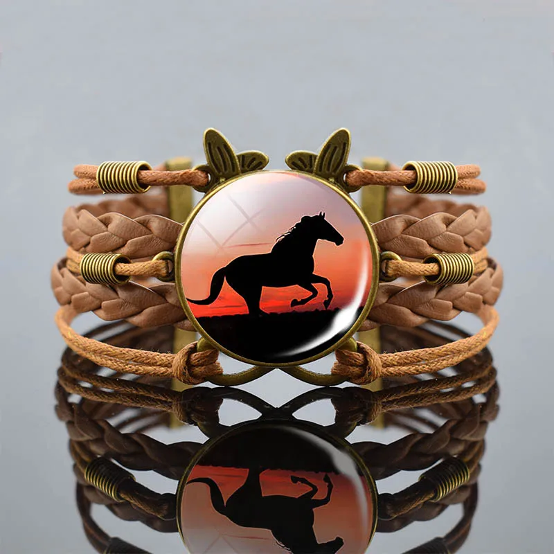 De vintage flätade banden framhäver en naturlig och rustik attraktionskraft, och de vackert utformade hästberlocken i högkvalitativ mässing med glas cabochon förstärker den unika hästdesignen. Smycket hyllar traditioner och hantverk från den amerikanska landsbygden, vilket gör det till ett utmärkt val för festivaler, rodeos eller för dig som vill ge din outfit en subtil men slående västertouch.