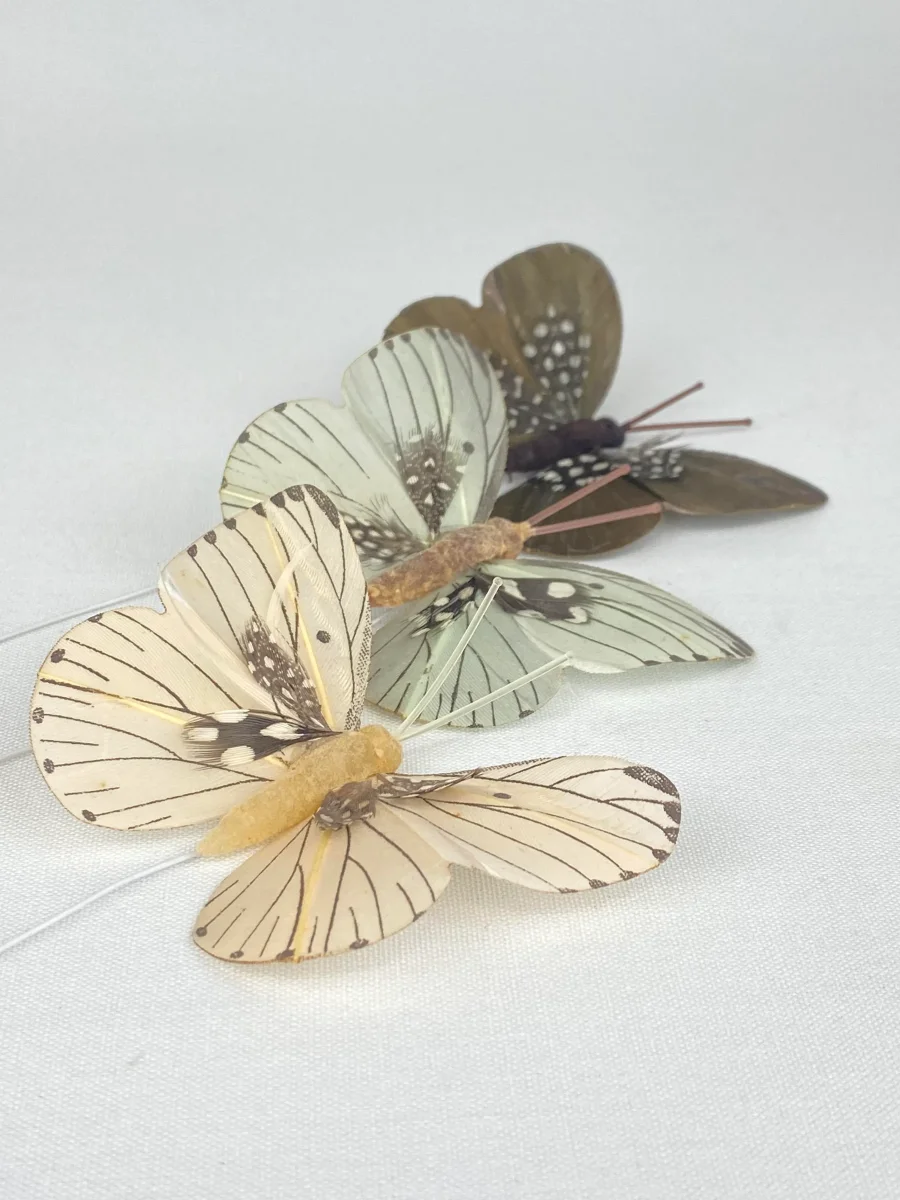Vackra dekorationsfjärilar att använda i blomsterarrangemang, i dörrkransen eller att fästa i påskriset. 8cm.