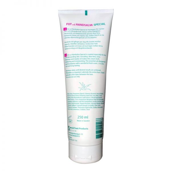 Fot & Handsalva Special är framtagen för speciellt krävande hud vid t.ex. ytliga sprickor, torrhet och förhårdnader. Stor tub, ekonomisk, få 50 ml på köpet. Salvan verkar balanserande, ger huden fukt, näring och en skyddande fettbarriär. Fot & Handsalva Special bibehåller hudens mikromiljö, understödjer en hälsosam och motståndskraftig hud. Detta med hjälp av ämnen som Karbamid, Bivax, Jojobaolja, Aloe Vera och de eteriska oljorna Bergamott och Eukalyptus m.m.