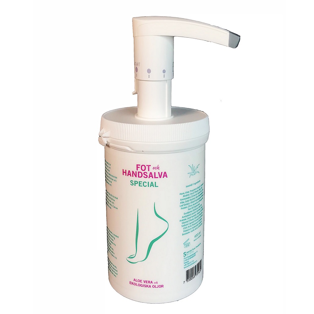Fot & Handsalva Special är framtagen för speciellt krävande hud vid t.ex. ytliga sprickor, torrhet och förhårdnader. Klinikburk med kraftig, hållbar effektiv pump som återanvänds. Salvan verkar balanserande, ger huden fukt, näring och en skyddande fettbarriär. Fot & Handsalva Special bibehåller hudens mikromiljö, understödjer en hälsosam och motståndskraftig hud. Detta med hjälp av ämnen som Karbamid, Bivax, Jojobaolja, Aloe Vera och de eteriska oljorna Bergamott och Eukalyptus m.m.