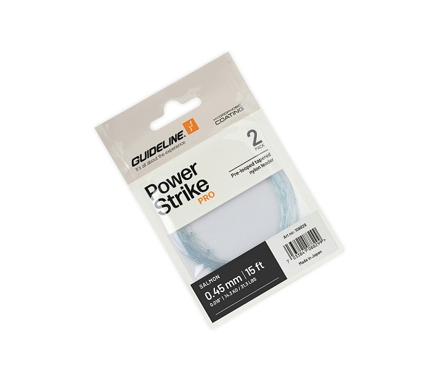 Guideline Power Strike Pro Salmon 15ft 2-pack – De 15 fot långa laxtafsarna levereras alltid i 2-pack, och förpackningen är UV-beständig med blixtlåsstängning, så att du säkert kan förvara dem i västen eller ryggsäcken. Varje tafs har en färdig ´Perfection Loop´ ögla i bakänden för smidig montering till öglan på din shooting head, och kommer i en diskret ljust rökgrå färg för mimnimal synlighet i vattnet. Taperingsdesignen är resultatet av många års erfarenhet på vattnet, och är finjusterad för laxfiske och spey-kastning med moderna linor för lax och steelhead. Den kraftiga buttsektionen och taperingen säkerställer effektiv energitransport hela vägen ut till flugan, och spetsdelen är lång nog för att du ska kunna knyta flugan direkt till tafsen utan att lägga till extra spetsmaterial.