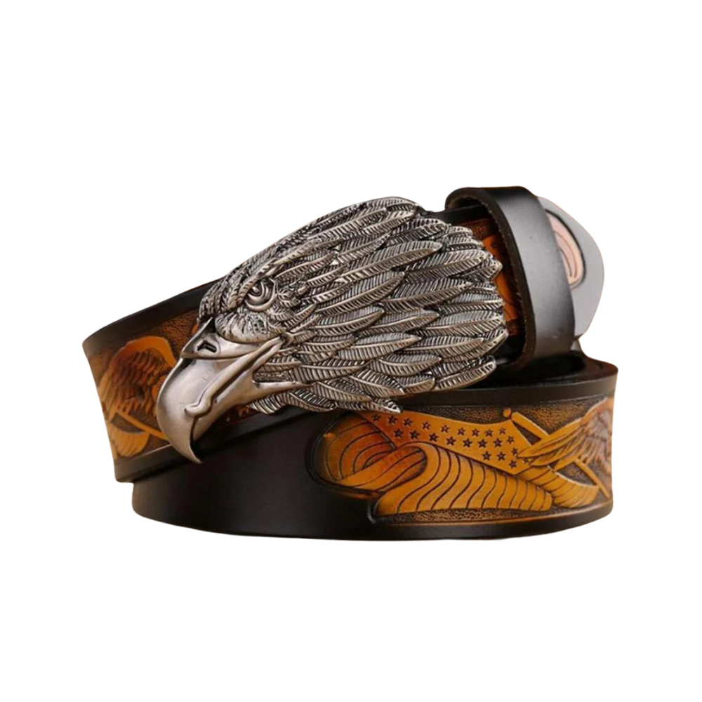 Spännet, tillverkat i solid metall, är inte bara hållbart utan pryds även av en detaljerad örnform vilket ger bältet en genuin westerns touch. Finns i populära och klassiska färger som kaffe, svart och khaki, gör den mjuka men robusta kvaliteten på det äkta lädret att bältet är lika praktiskt som det är stilrent. Med en bredd på 3,8 cm blir detta bälte det perfekta valet både för vardagliga outfits och för att göra ett starkt statement vid speciella tillfällen.