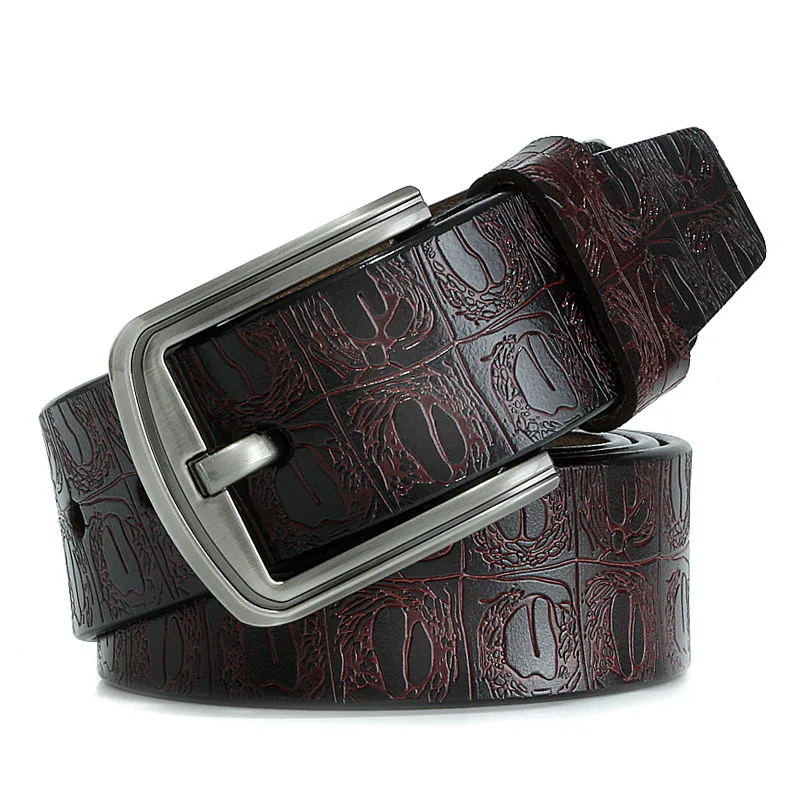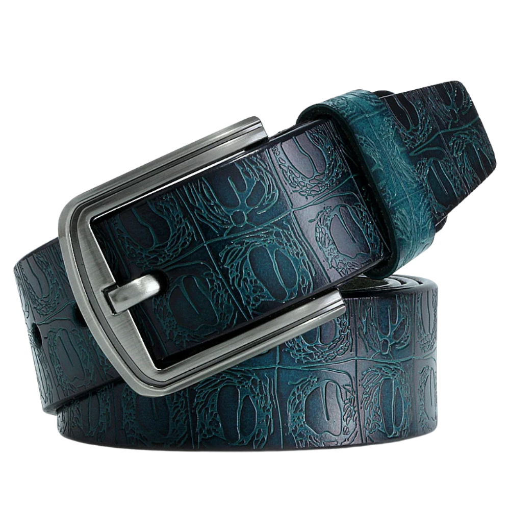 Upptäck vårt herrbälte av präglat läder, tillverkat av högkvalitativt nötkreatursskinn som garanterar både hållbarhet och en robust, stilren elegans. Den unika präglade ytan bidrar med en äkta westerncharm och ger en sofistikerad look, perfekt att bära både vardag och vid mer festliga tillfällen. Oavsett om du söker ett bälte för dagligt bruk, för en avslappnad stil eller speciella evenemang, erbjuder detta bälte en idealisk kombination av funktionalitet och samtida mode.