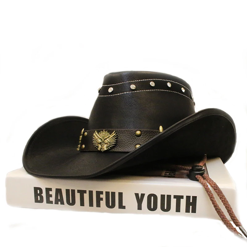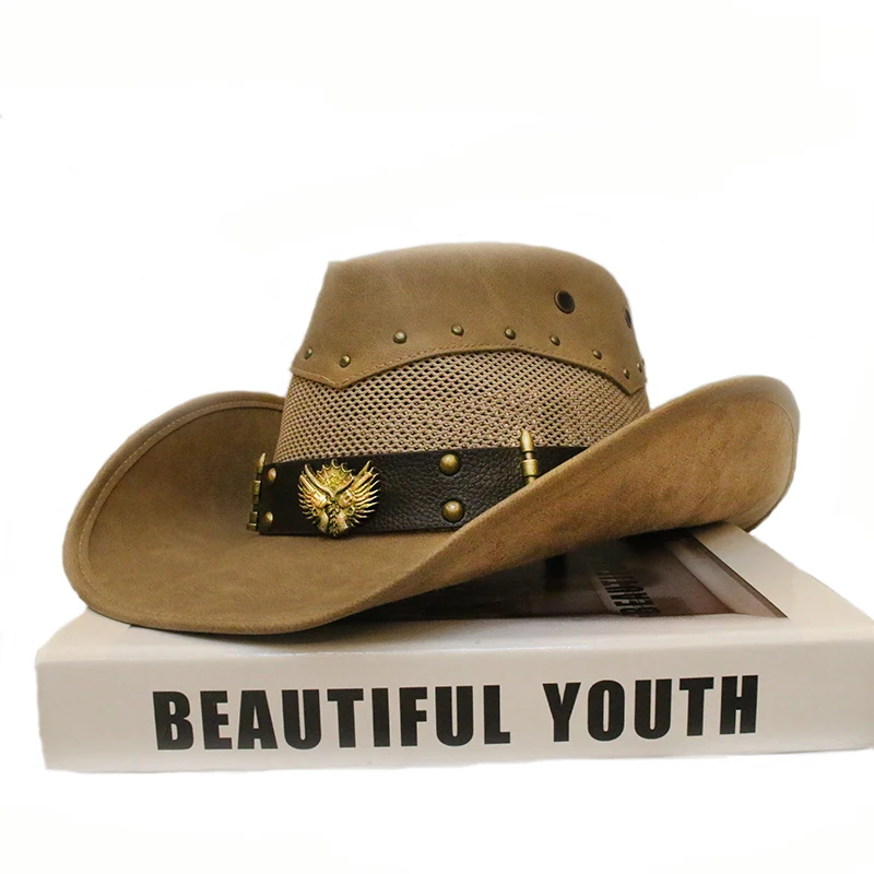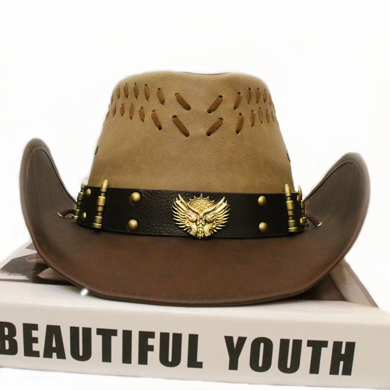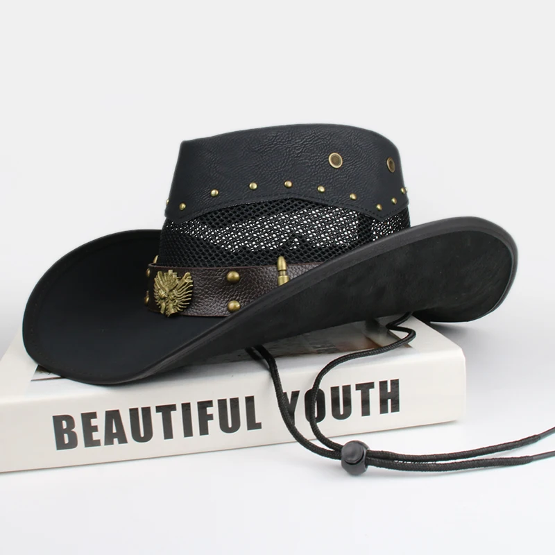 Denna lädercowboyhatt stoltserar med en unik design, där iögonfallande detaljer såsom kulor och revolverinslag ger en markant karaktär. Perfekt för dig som vill stå ut i mängden – den här hatten kombinerar en robust känsla med en elegant stil, vilket gör den till ett utmärkt komplement till alla dina outfits. Den breda skärmen ger dessutom ett enastående solskydd, perfekt anpassad för alla dina utomhusäventyr.