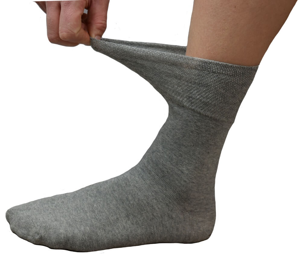 Detta är en strumpa med lös resår och handkettlad tåsöm. Det betyder att tåsömmen är platt för att inte irritera och skava över tårna. Strumpan är stickad på många nålar för maximal stretch.