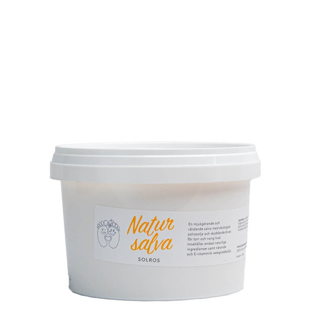 Natursalva Solros är en fet, vattenfri och mycket dryg natursalva som ger intensiv vård och skydd till torra, känsliga och utsatta hudområden. Den är särskilt effektiv för torra fötter, spruckna hälar och narig hud, men kan med fördel användas på hela kroppen där huden behöver extra omsorg.