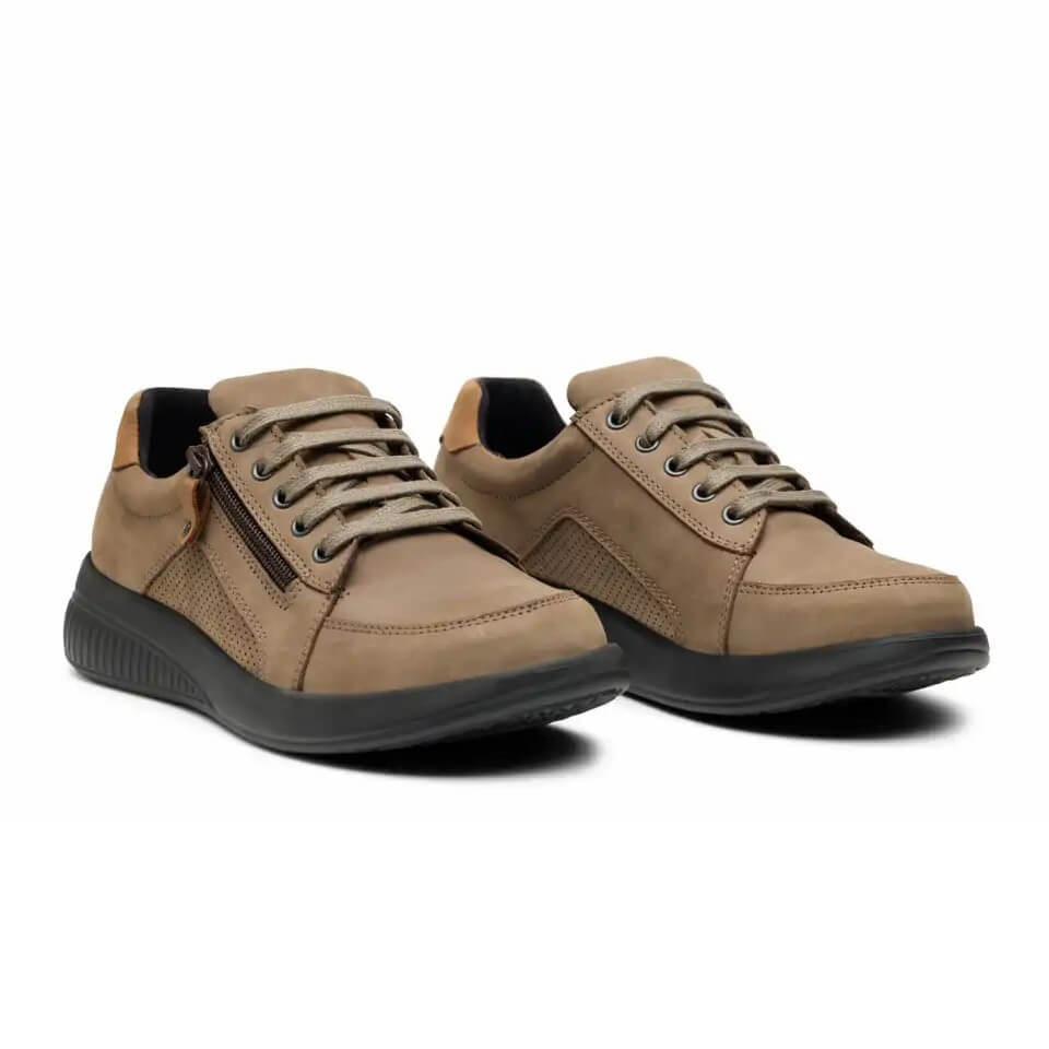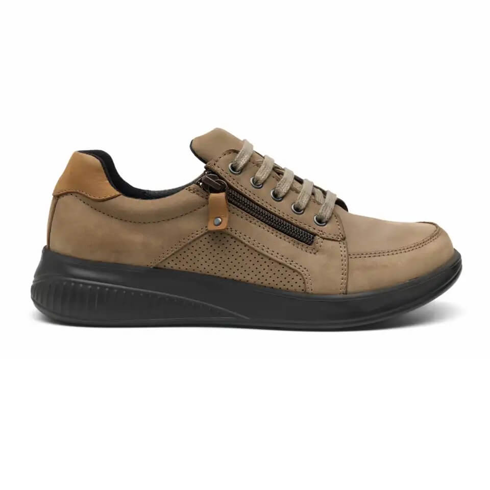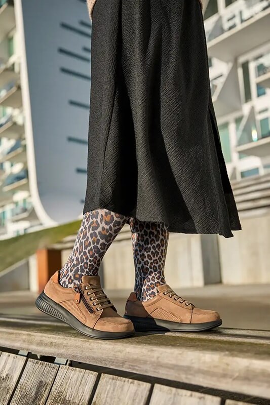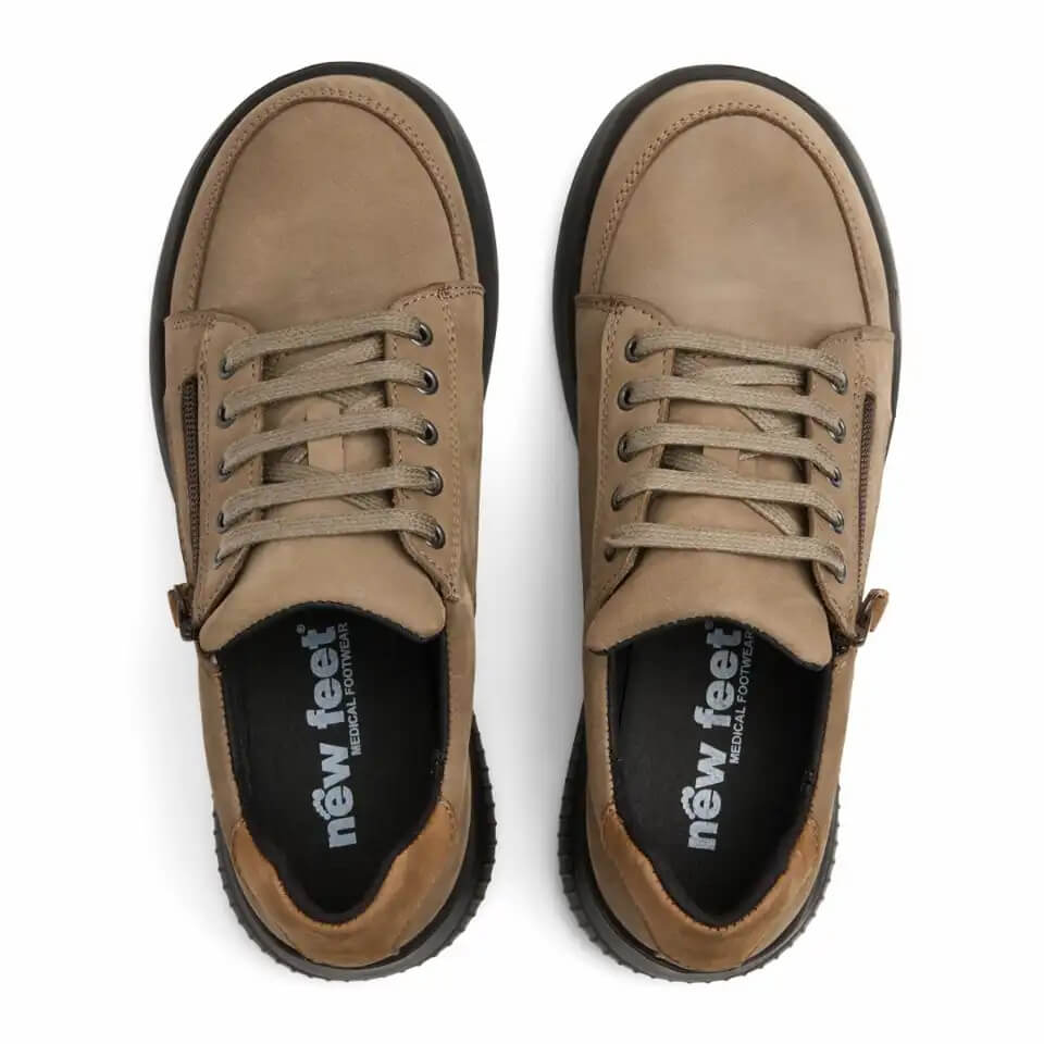 Sköna promenadskor från New Feet med en stabil hälkappa. Inga invändiga irriterande sömmar och gjord i mjuka material som är snälla mot huden på foten. Smidig dragkedja vid sidan om snörningen för att underlätta av- och påtagning. Hällyft 30 mm – fall 17 mm.