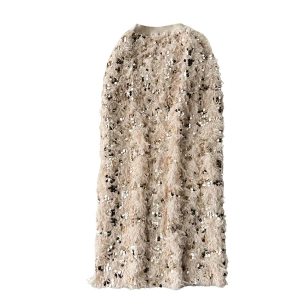 Kjolen har ett empirelinne och en icke-stretchig midja för att garantera en bekväm och säker passform. Den eleganta A-linjen ger en vacker svängning medan de glittrande paljetterna adderar en touch av glamour. Oavsett om du matchar kjolen med en chic blus för kontoret eller en enklare topp för en ledig look, är den ett mångsidigt tillskott till din garderob som alltid står ut.