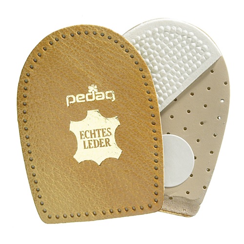 Snedställd hälkudde i läder från Pedag. Rätar upp och kompenserar vid t.ex hjulbenthet eller kobenthet på grund av pronation eller supination.