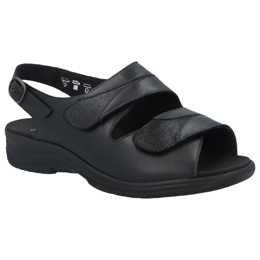 Skonsamma och sköna sandaler med extra bred passform och urtagbara sulor. Gjorda i mjukt läder av högsta kvalité och har smidiga kardborreband för optimal justering av passform. Yttersulan är tillverkad av halkfri plast (PU) med en kilklack på 18 mm.