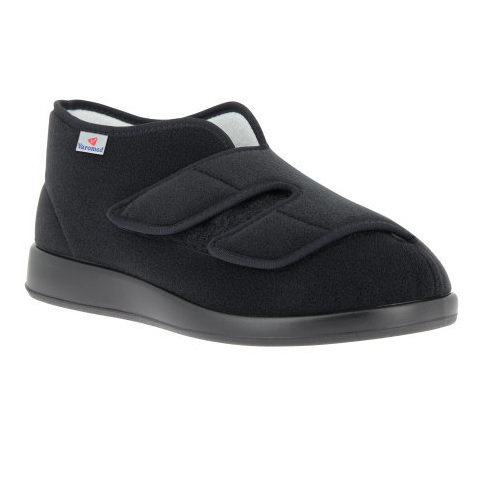 Svart bred specialsko med något högre skaft för extra stabilitet. Skorna passar utmärkt för känsliga fötter med sitt mjuka frottéfoder och avsaknaden av skavande sömmar. Kan öppnas upp rejält och har kardborreknäppning vilket gör de enkla att ta av och på. Fungerar utmärkt för både inomhus- och utomhusbruk.