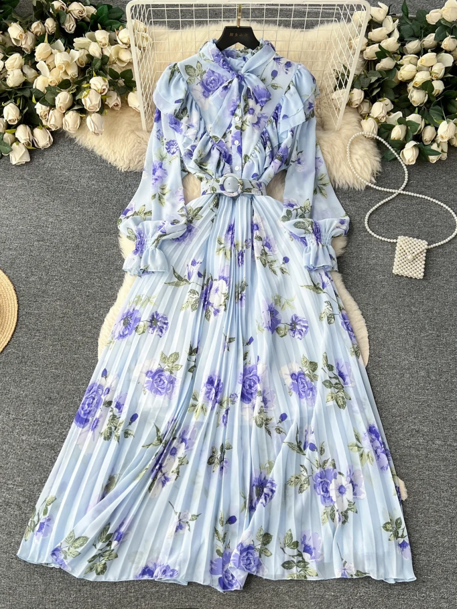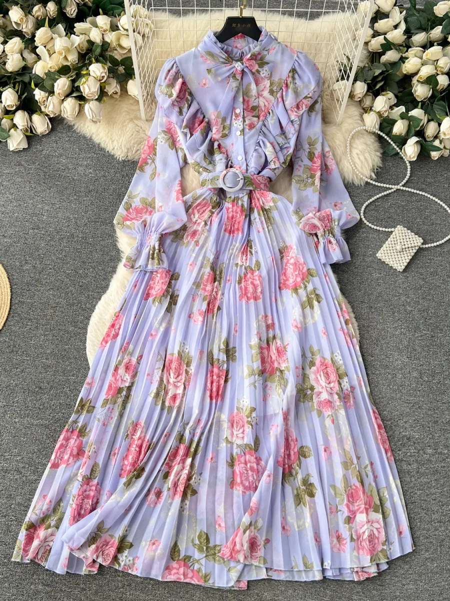 Denna vintage blommiga westernklänning utstrålar tidlös elegans med sitt delikata blommönster och flödande silhuett. Perfekt för alla årstider kombinerar klänningen en rosettkrage med sensuella volanger, vilket ger en sofistikerad prägel åt den westerna designen. Den här unika klänningen passar lika bra vid formella tillställningar som vid mer avslappnade sammankomster och blir på så vis ett utmärkt statement-plagg.
