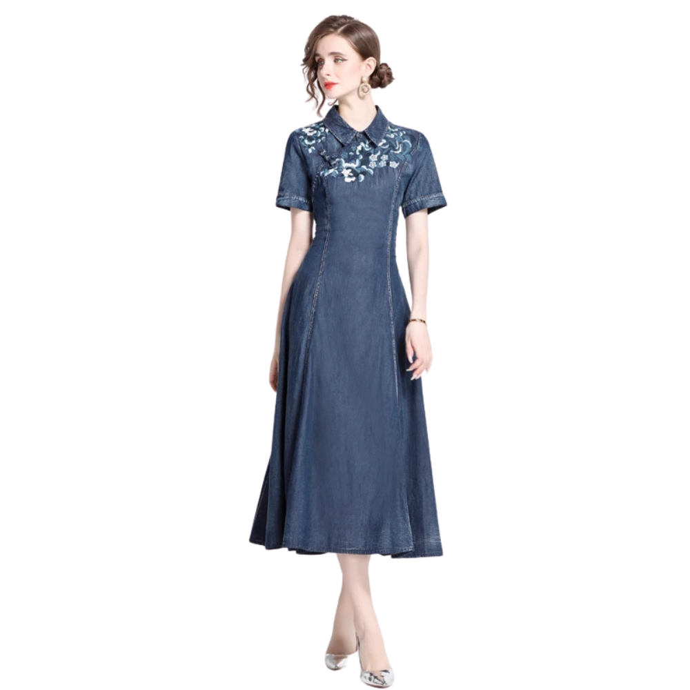 Med sin eleganta nedvikt krage och den diskreta enkelt utformade knappslån skapar klänningen en unik blandning av avslappnad stil och klassisk elegans. De korta ärmarna bidrar till en sval sommarstil, medan de utsökta broderade detaljerna ger en exklusiv känsla. Oavsett om du kombinerar den med robusta cowboyboots eller bekväma sandaler, blir detta plagg ett självklart val från dag till kväll.