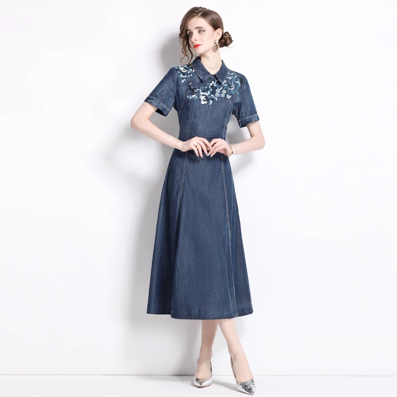 Vintage denim broderad cowboyklänning med korta ärmar
